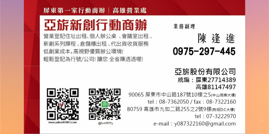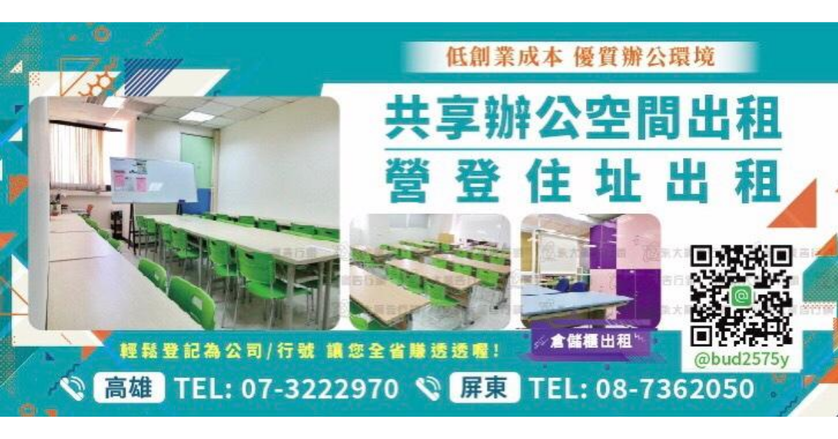 ◎營登住址出租年繳~特惠專案年繳每月2800元,免押金輕鬆登記為行號/公司 讓您全省賺透透喔! 尚有辦公桌(室) 歡迎來電洽詢◎(洽詢電話:0975-297445(陳副理)歡迎加入line@好友>>>點網址加入好友